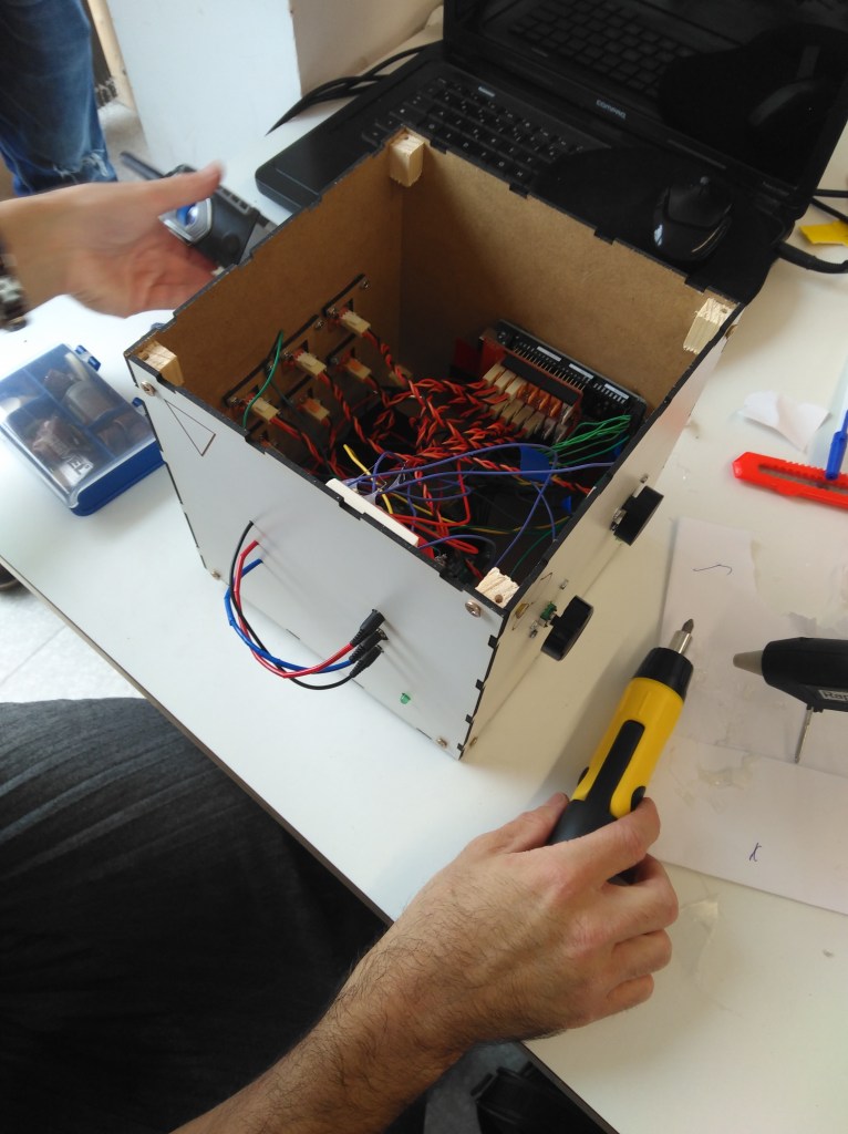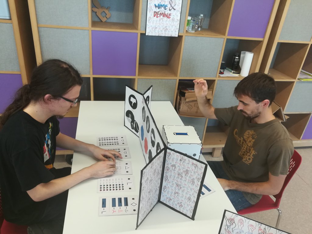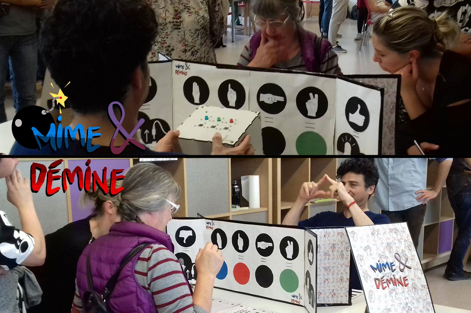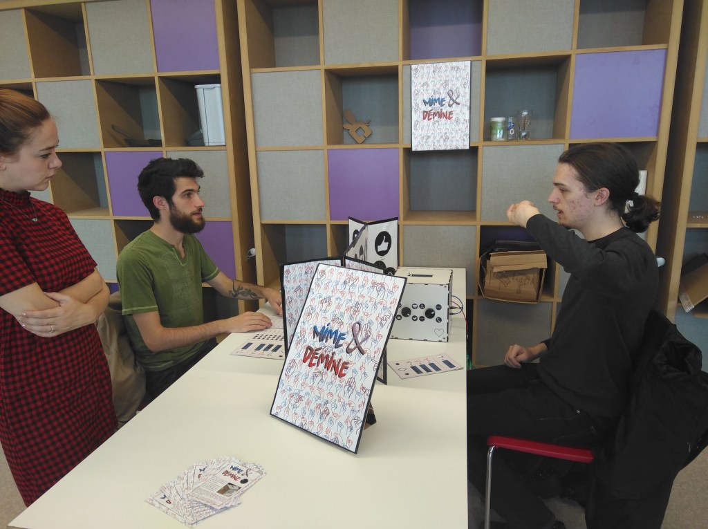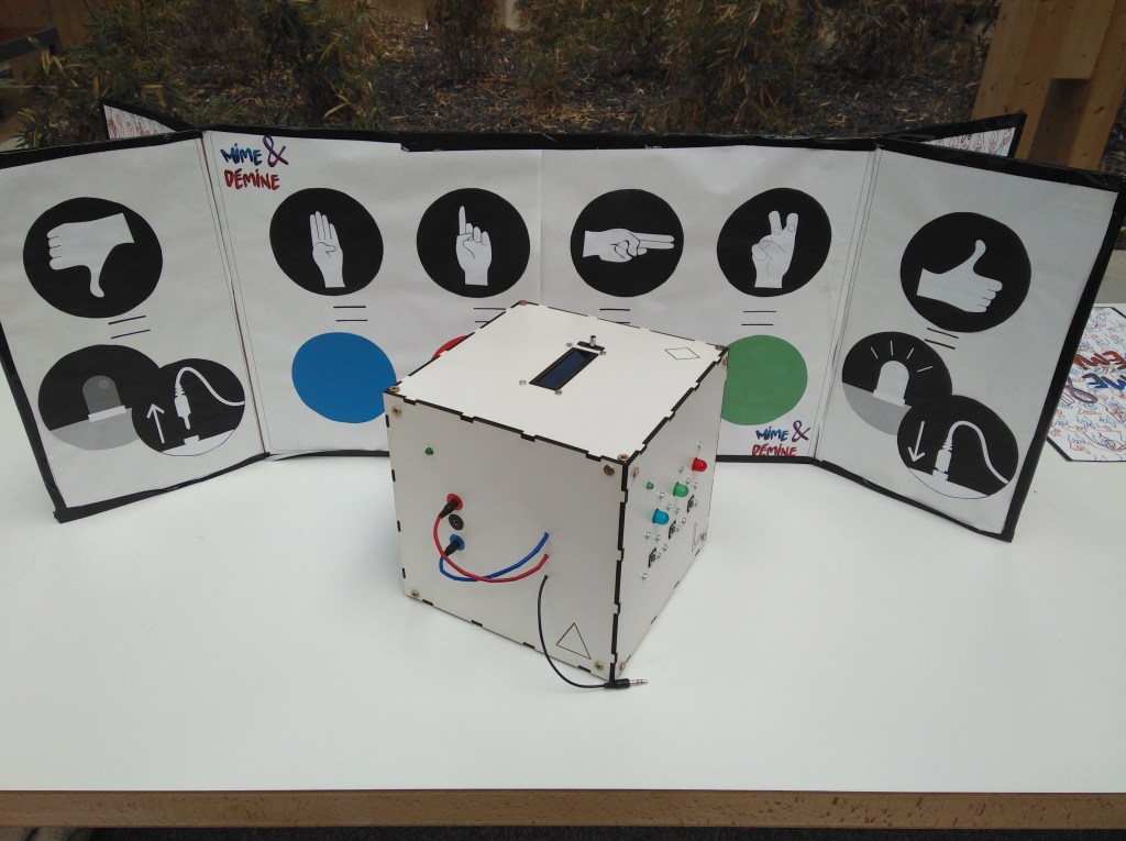 Mime & Démine is a cooperation physic game, inspired by Keep Talking and Nobody Explodes, designed to be deaf-friendly. The bomb is a cube with an Arduino technology in it, connected to several wires and buttons.