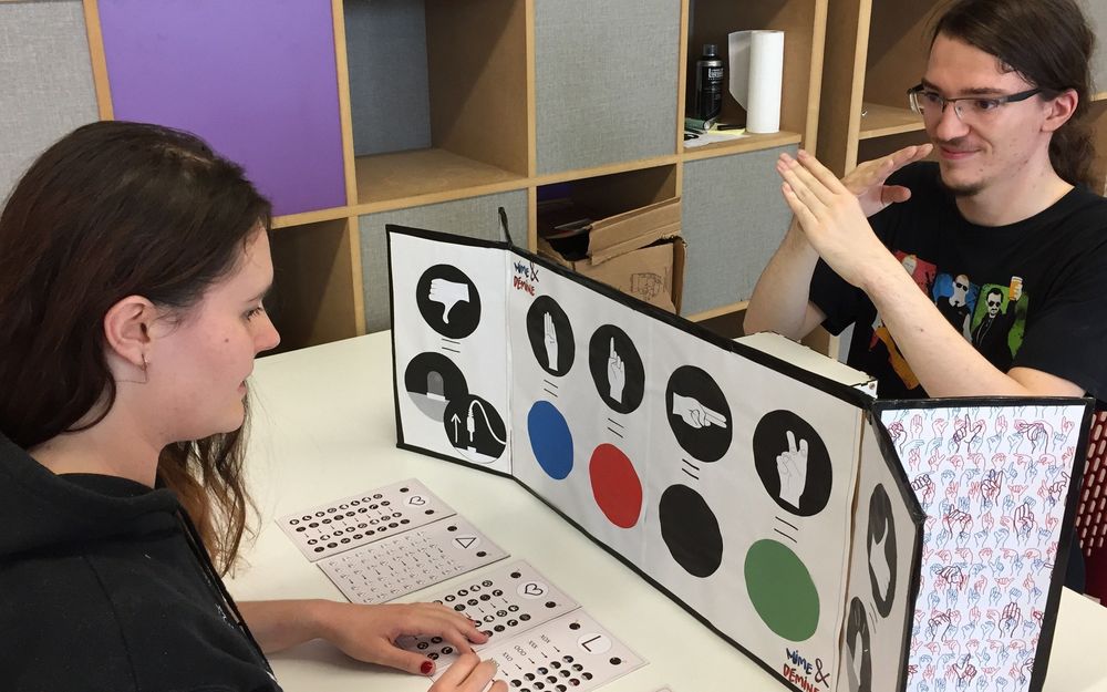 One player has the bomb, the other has the instructions to defuse it. Separated by a panel with some sign language on it, they have to find a way to communicate the instructions, without any words.